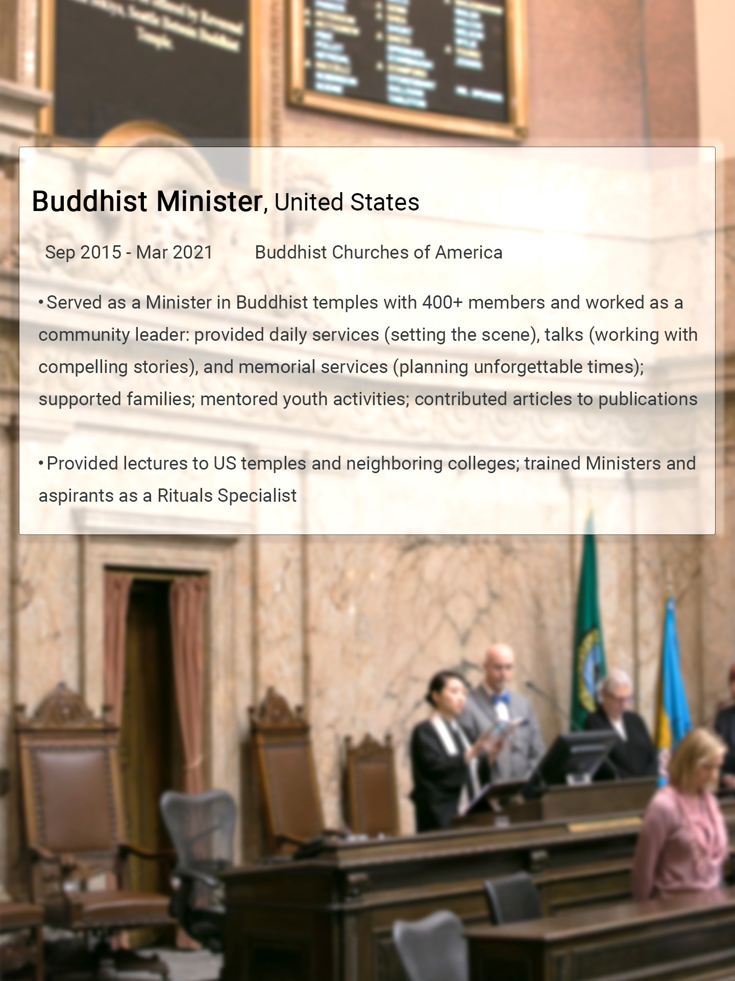 Daily Services, Talks, Memorial Services. Lectured and Trained Ministers as a Rituals Specialist